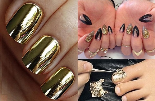 Приветствуется как одноцветный маникюр в золотых тонах, так и сочетание золотого и чёрного, бордового и других цветов.