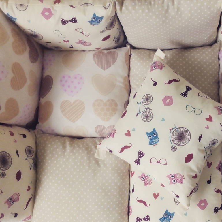 Бортики в детскую кроваткуДевочки, доброе утро! Представляю Вам бортики ручной работы - "Ванильная фантазия"! В комплекте 12 подушечек размером 30х30 см для всех сторон стандартной кроватки 120х60 см. Бортики выполнены из высококачественного хлопка с гипоаллергенным наполнителем Холофайбер. Цена таких бортиков всего 2000 руб!