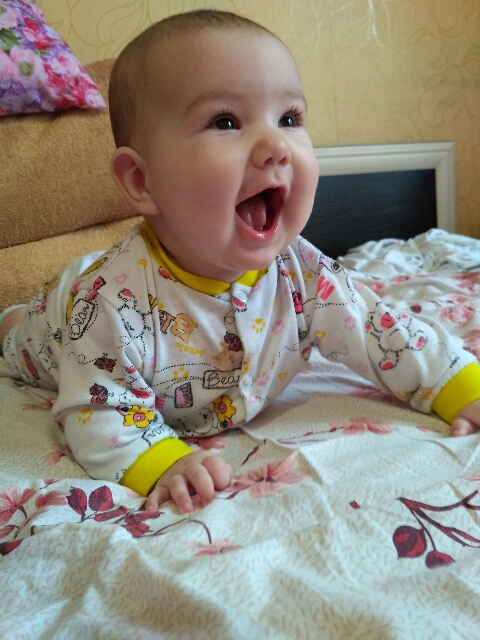 В 4,5 месяца стала чётко отличать меня от других людей. Если раньше к любому шла на руки, то сейчас ей надо время привыкнуть. И даже когда берут, она всё время держит меня в поле зрения. Я и не думала, что это так приятно!