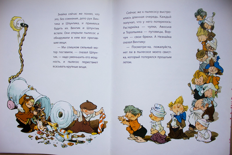 Страсти улеглись,когда сын с таким легким вздохом заметил, глядя на пылесос " А Масик и Чубик себе сами пылесос сделали". Вот оно что, единожды прочитанная и отложенная на попозже книга оказывается произвела больший интерес,чем мне могло показаться, только вот имена сын не запомнил:) Масика и Чубика Винтика и Шпунтика достали из шкафа и еще дооолго они туда не возвращались, кочевали между столом, тумбой, кроватью и Никитиным домиком. И что удивительно, уже почти год книга не забывается, она уже не хит,но читается регулярно.