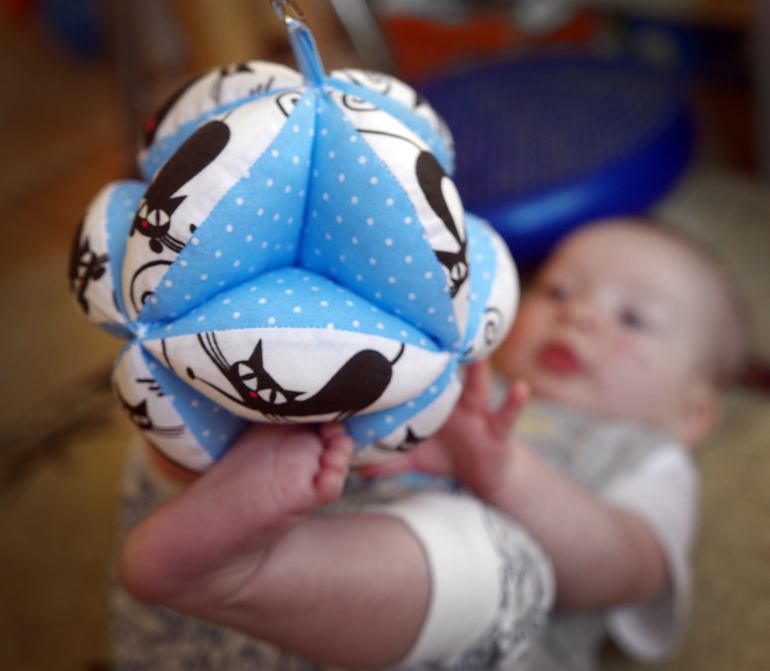 Дети удивительны тем, что постоянно вынуждают прыгать выше собственной головы, крушить годами возводимые стереотипы, сметать к чертям комплексы и предубеждения. На все, чему научил меня Даня, уйдет не одна сотня букв, да и Артемий не отстает... Только Даня у нас за прокачивание интеллектуальных и психических навыков, а Тема - за практику и моторику))))) Для Артемия хочется постоянно что-то делать. Почему - неизвестно, какое-то специфическое тепло он излучает, на которое хочется ответить, в том числе игрушками, сделанными своими руками. И вот в его месяц я конструирую для него мобиль Мунари, а там и до мячика Такане руки дошли. И это при том, что я великий рукожоп: шить я не люблю, не умею и боюсь (теперь, наверное, в прошедшем времени). Уроки труда мне снились в кошмарах, единственная сшитая вещь - юбка - была уродливой и никуда не годной. Трудовичка на меня орала, иголки из рук валились, утюги горели в руках (в прямом смысле), папа утюги чинил, я рыдала у него на плече... И вот я вся из себя такая криворукая беру у соседки машинку, сама разбираюсь в хитростях ее использования, мы вместе с Даней покупаем ткань и шьем довольно муторный в изготовлении мячик) Я довольна, Артемий доволен, Даня хочет что-то пошить еще, минус комплекс в моей копилке) Ура!)