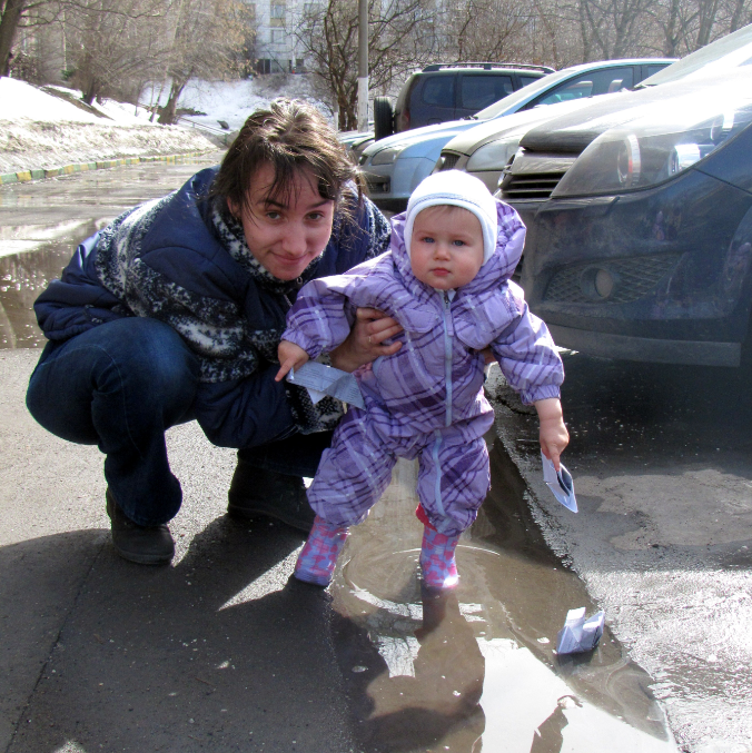 А мы вчера кораблики пускали. Дина норовила догнать кораблик и забрать его - все в дом.