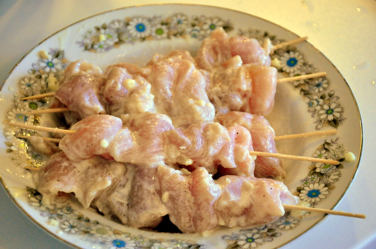 Готовые шашлычки подавать в горячем виде с гарниром и соусом на ваш вкус.