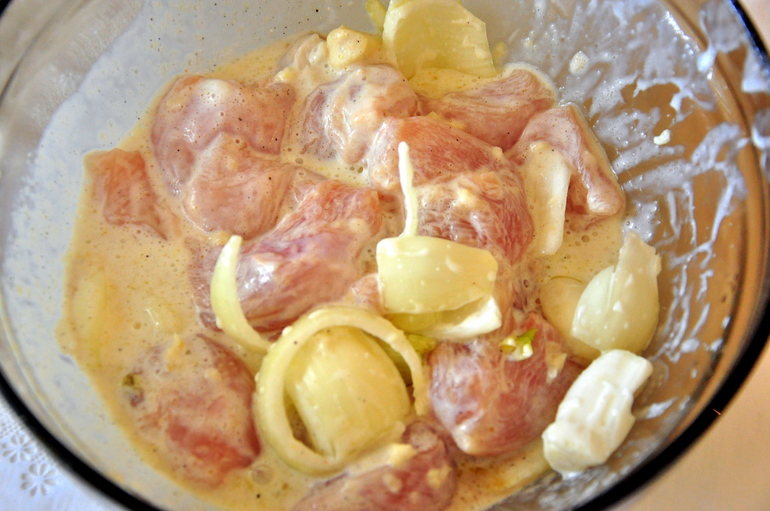 Для маринада смешать все ингредиенты кефир, пропущенный через пресс чеснок, нарезанный на крупные кольца лук, соль и перец.