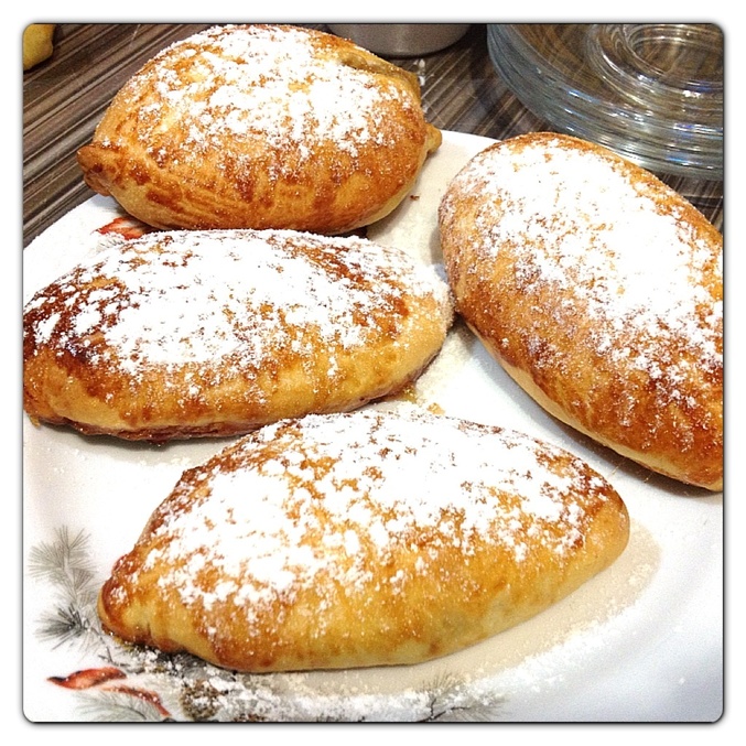 А здесь с клубничным вареньем и апельсиновым джемом. Сверху пудра.