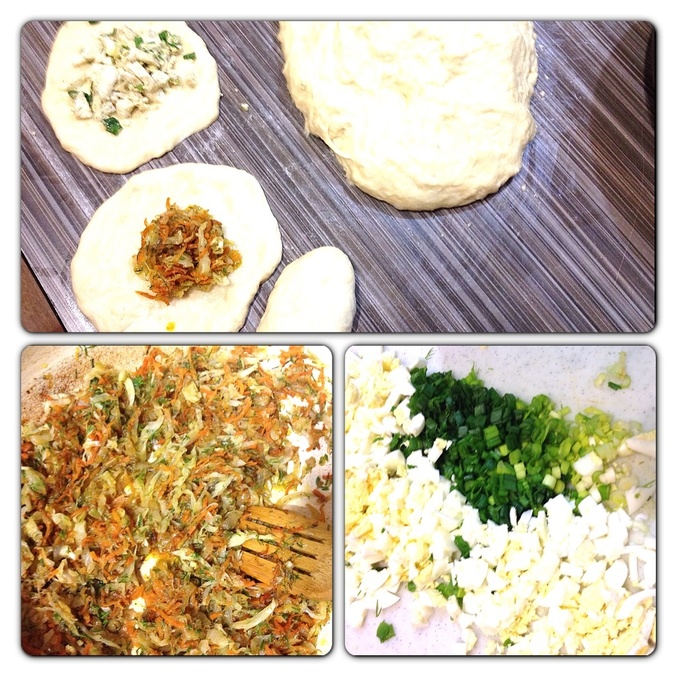 У меня с вареным яйцом+зеленый лук. И жареная с луком и морковкой капуста.