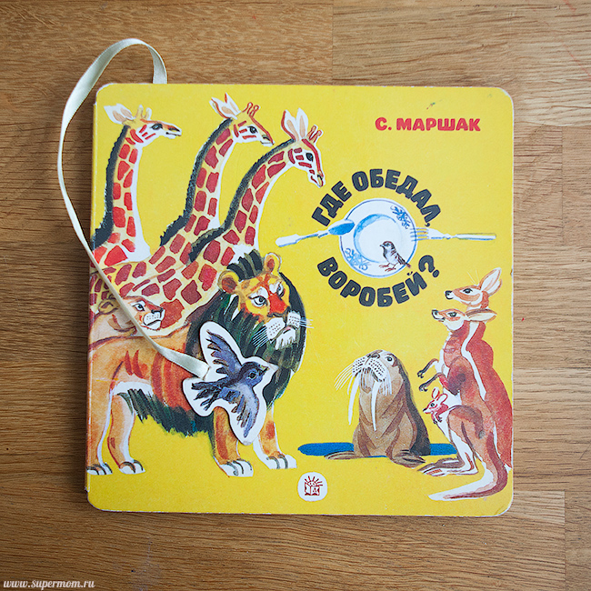 Прелесть книги и в тех самых иллюстрациях родом из детства, и в интерактивной составляющей: на конце веревочки-ляссе приклеен воробей, который летает из клетки в клетку.