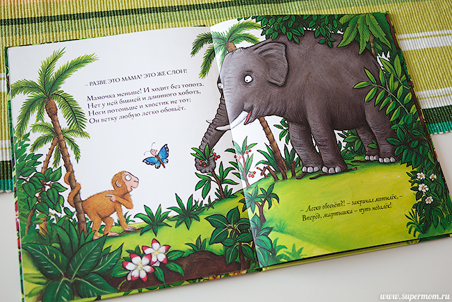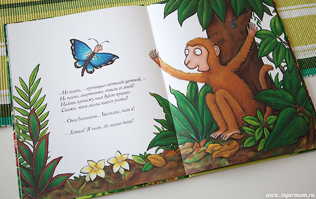 Эта книга о маленькой обезьянке, которая заблудилась в джунглях, и на помощь ей пришел непонятливый мотылек, который составлял со слов обезьянки портрет и подсовывал ей в качестве мамы то одного зверя, то другого.