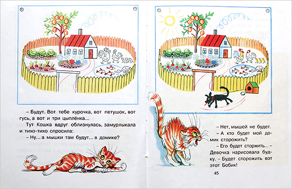 И так далее. В общем, повторение очень важно маленьким детям для усвоения сюжета и для того, чтобы они потом легко смогли перейти от простого к сложному.