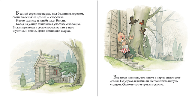 Это милая и очень простая, почти примитивная история о стороже в парке, к которому в студеную зимнюю ночь стучались разные звери и просились к нему ночевать. И добряк дядя Вилли пускал всех и каждого, и искал каждому местечко в своей кровати.
