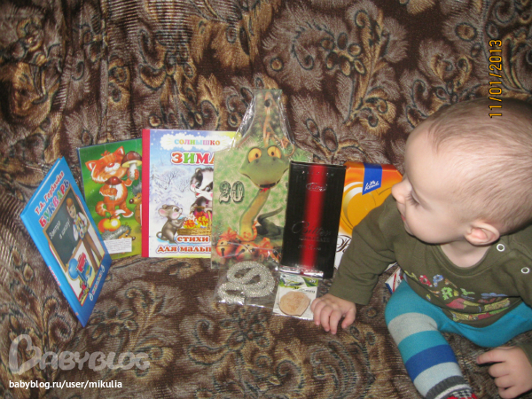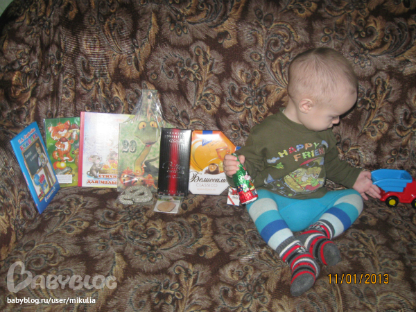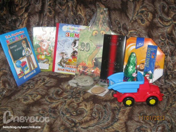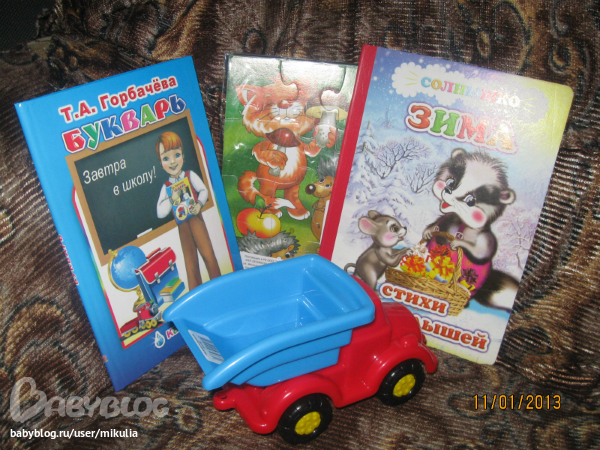 Это Мишкины подарки. Машинку схватил как только я открыла коробку)) Книжку уже почитали (точнее посмотрели картинки, т.к. читать он не дает) Букварь и мозайку отложу немножко на потом))