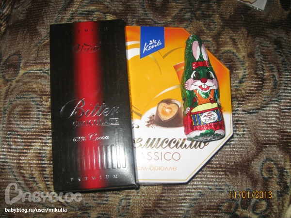 Это самая сладкая часть подарков))) Конфетки уже почти все съели, очень вкусные. А вот шоколадку и зайчика не дала на растерзание до фотосессии))