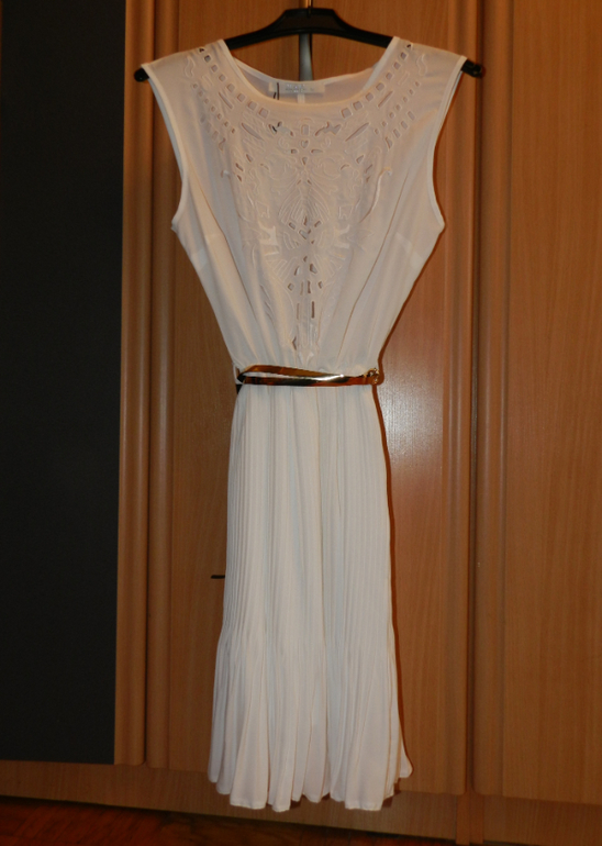 Платье почти невесомое, очень легкая ткань белого цвета, верх- выбитый узор, низ - плиссированная юбка. К платью идет тонкий золотой поясок. Размер 42-44 (это XS-S, 36-38 р. европейский). Длина чуть выше колена. Платье новое, с бирками.