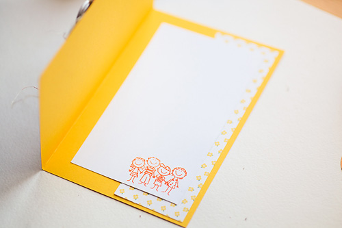 • Приклеиваем скрапбумагу с декором к основе. Внутри оформляем открытку полоской, оставшейся от листа 15х15, можно добавить подложку под текст из офисной бумаги и оформить весёлыми штампиками.