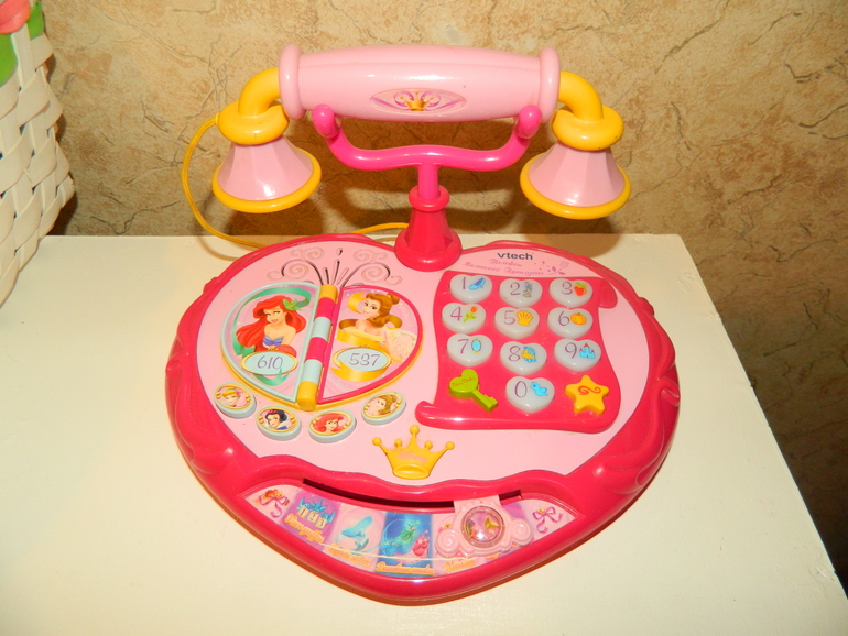 Обучающий телефон маленькой принцессы Vtech поможет ребенку выучить цифры и новые слова , а любимые персонажи из мультфильмов помогут сделать обучение привлекательным. Учим цифры Тренируем память Слушаем мелодии Особенности: 5 обучающих программ 10 светящихся кнопок 4 принцессы из мультфильмов Телефонная книжка с переворачиваемыми страницами Возможность общения с принцессами.Телефон в хорошем сотсоянии, все функции работают, есть царапина внизу на фото видно - белая, там где переключение программ. 500 руб.