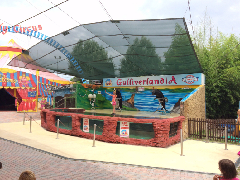 В городке Линьяно буквально в 7-8 км от нас была еще куча развлечений - огромный аквапарк и зоопарк в которых мы не были, и парк Гулливерландия, в котором нам очень понравилось. Никуська скакала на надувном городе, бегала по детским площадкам с малышами, и все мы были в восторге от представления с морскими котиками, от океанариума и я в итоге побывала на башне и полюбовалась панорамой Линьяно, хоть выглядела эта башня страшновато.