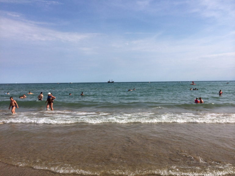 Море теплое и довольно чистое, пляж просто огромный, песочный, 8 км длиной и аж 300 метров шириной. Само море даже не видно когда приходишь на пляж - оно за зонтами ))) На пляже есть все - бары-рестораны, площадки для детей, переодевалки, души туалеты - все очень чисто и цивильно. Я думала что нам придется покупать зонт с лежаком за 8-10 евро на день, но мы очень даже обошлись и без этого. у самого моря до зоны с зонтами можно было всегда найти место и расстелить свои полотенца. Тень нам делала коляска )))