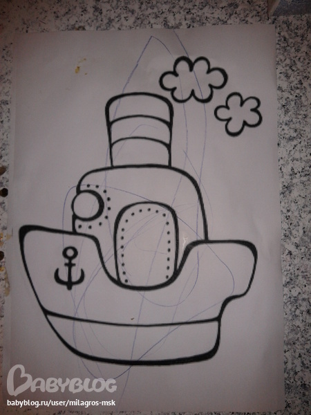 Пытались раскрасить кораблик. У детей оказалось свое видение. Никита вообще калякнул немного и убежал, Максим старательно выводил круги и тыкал в них пальчиком, явно радуясь своим творческим успехам=)