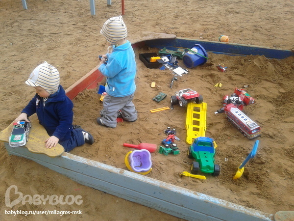 Очень нас порадовал поход на прогулку. Песоцница встретила нас горой машинок!!! Добрые люди как знали, что нам очень актуально!