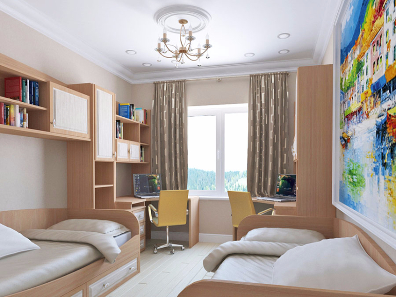 Расположение мебели примерно как на фото, пока особых идей по конкретной мебели нет, будет зависеть от финансов. Столы вдоль окна с местами для хранения. Спортуголок и шкаф для повседневных вещей. Надеюсь впихну все это в 12,5 метров...