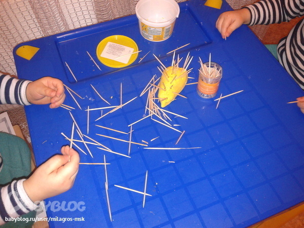 Поскольку в субботу мать ушла в загул, дети остались без дерева и листиков, а вот ежика мы вечером отлично полепили и приделали ему иголочки-зубочиски. Пытались ещё делать солнышко с лучиками, но дети не прониклись, только отрывали лучики от бедного солнца=))