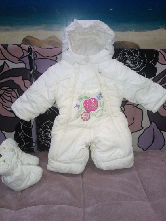 Очень лёгкий и тёплый комбинезон,состояние отличное. Использовался 3 месяца. Подходит с рождения(мы выписывались в нем). Ножки могут как застегиваться на молнию,пока малыш маленький,а потом можно пристегнуть пинетки(в комплекте). 1600 руб.