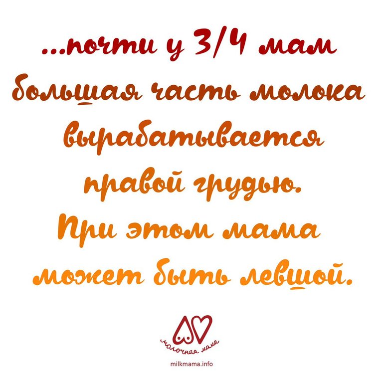 Почти у 3/4 мам большая часть молока вырабатывается правой грудью. При этом мама может быть левшой. Но это не означает, что мама, которая по каким-то причинам не может кормить правой грудью, не сможет выкормить ребенка. Природа предусмотрительна с запасом. В интернете множество вдохновляющих историй мам, которые выкормили ребенка одной грудью. Любой.