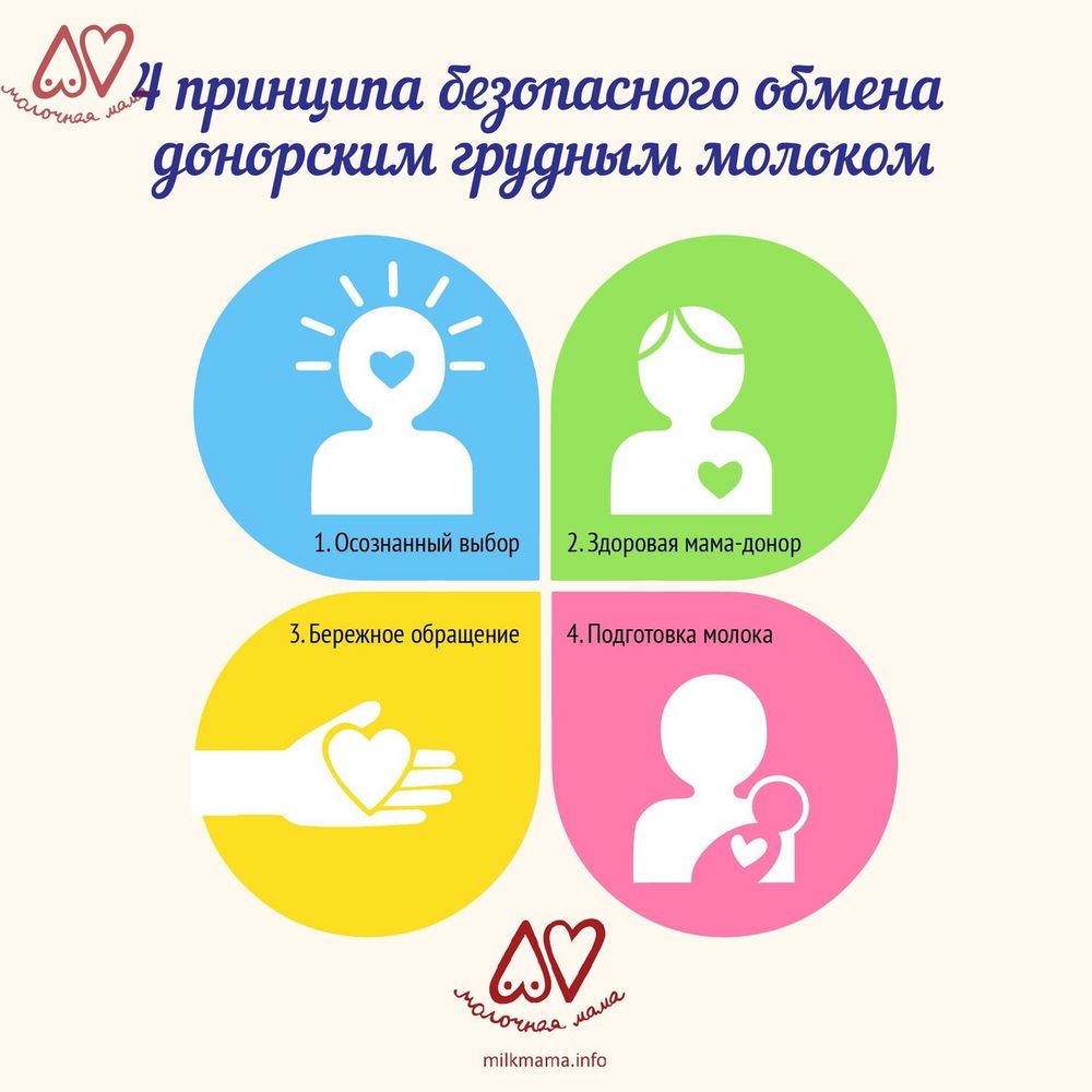 Четыре основных принципа безопасного обмена донорским грудным молоком:1. Информированный (осознанный) выбор - понимание всех особенностей, вкл