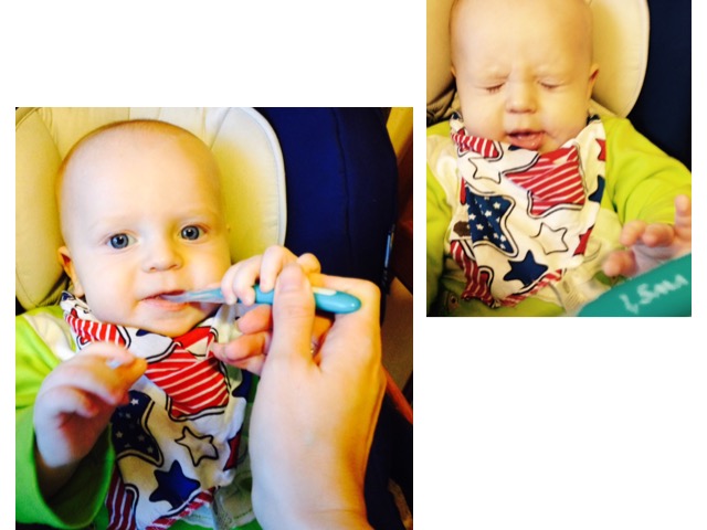 Наконец то ! Планировалось начать неделю назад и даже ложку торжественно купили! И заболели((( врач порекомендовала сегодня плпробовать! И вот сегодня в меню у Андрюшки появилась цветная капуста! Но что то пошло не так! Ложечка у нас малюсенькая поэтому позволила дать четыре по четвертинке вот на третьей сына и перекосило, как от лимона- распробовал
