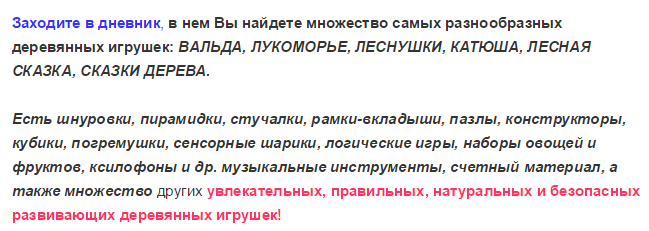 Заходите в дневник, занимаюсь разными деревянными игрушками: Вальда, Леснушки, Катюша, Лесная Сказка, Лукоморье, Ала*тойс.