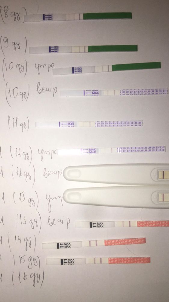 Ylia Go, у меня такой же цикл , начала делать тесты с 8 дц может и рано , но не хотела пропустить ) делаете каждый день , ближе к овуляции это где-то 12-15 дц можно делать 2 теста ( утро , вечер ) видите две полоски яркие значит оно , через 12-48 часов наступит овуляция и пришло время работать 😀тесты лучше брать одной фирмы говорят , я брала разные вроде ничего не изменилось 🤷🏼♀️Вот пример , 14-15 дц