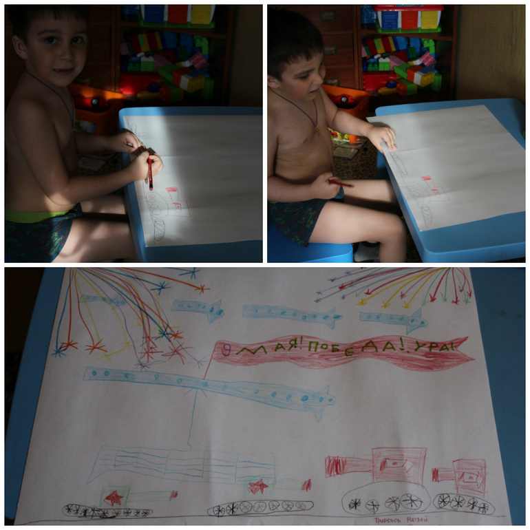 Рисовали в сад, каждый сам выбрал чем будет рисовать, перед тем как рисовать конечно же показала какие вообще дети рисуют рисунки ко Дню Победы, но сейчас они любят рисовать танки, так что они только у нас и в ходу)