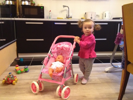Блин, и у нас чвяка((( Лучше б было сухо и морозец (((( Коляска у вас зачотная)) мы тоже кукол катаем, но больше всего любим сами там сидеть))) Милаха - смешнючая, с хвостиками )))