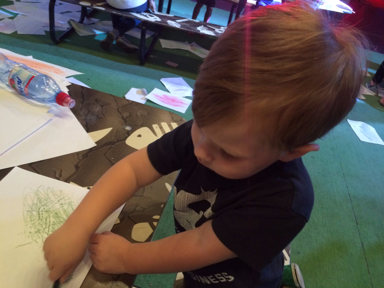 После зоны "зоопарка" небольшая игровая, с гигантскими паззлами (очень грязными))) и столами с трафаретами (вот это нам понравилось!) Унесли оттуда несколько рисунков динозавров, до сих пор гордо висят на холодильнике).