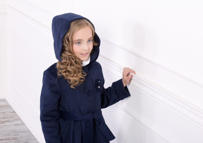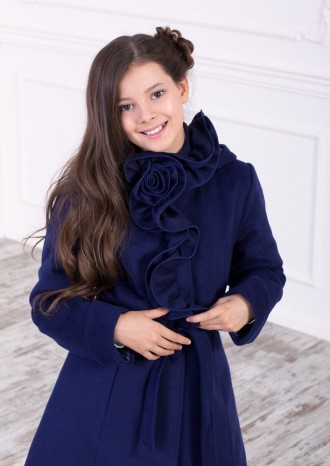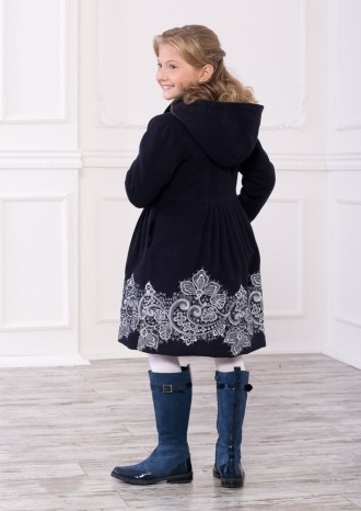 Модное пальто на стеганной утепленной холлофайбером подкладке для девочектемно-синего цвета с серебряной нитью смотрится просто потрясающе. Ткань смотрится оригинально и необычно, за счет в вышитого купона. Двубортная глухая застежка с серебристыми пуговицами в тон вышивки, маленький отложной воротничок, съемный капюшон, регулируемые манжеты на рукавах, сзади на линии талии хлястик делает эту модель универсальной.