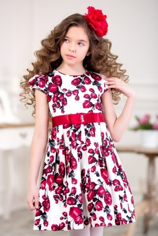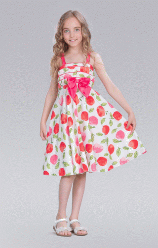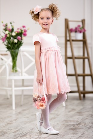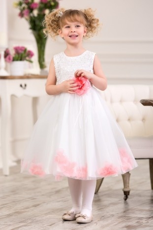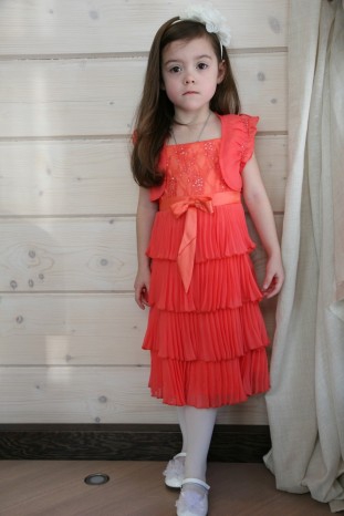 - Эффектное платье для маленьких модниц. Это платье подойдет для выступлений на концертах, а также для повседневной носки. Эффектный орнамент и декоративная отделка из гипюра по подолу придают этому платью неповторимый стиль. Подходит в качестве торжественной одежды. Платье с лифом из атласной ткани персикового цвета , рукава фонарики, с круглым вырезом горловины. Линию груди подчеркивают три нежные розочки, на спине пояс завязывается в бант, который помогает отрегулировать ширину платьев.