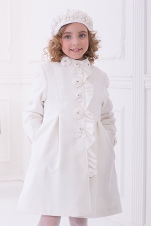 Расклешенное пальто с воротничком-стойкой утеплено холлофайбером. Впереди застежка на пуговицы, скрытые оборкой и россыпью декоративных цветов.