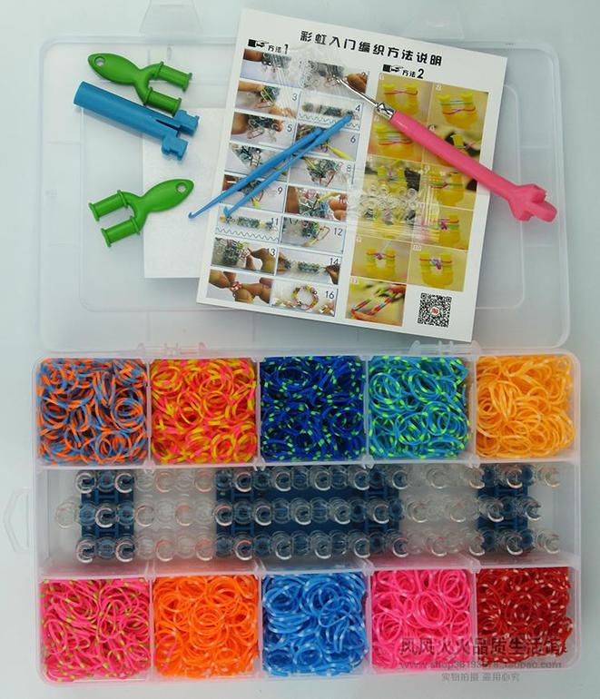 Набор с двухцветными резинками, в составе крючки, станок+маленький станок, 10 цветов резинок по 220 штук каждого цвета. 990 руб