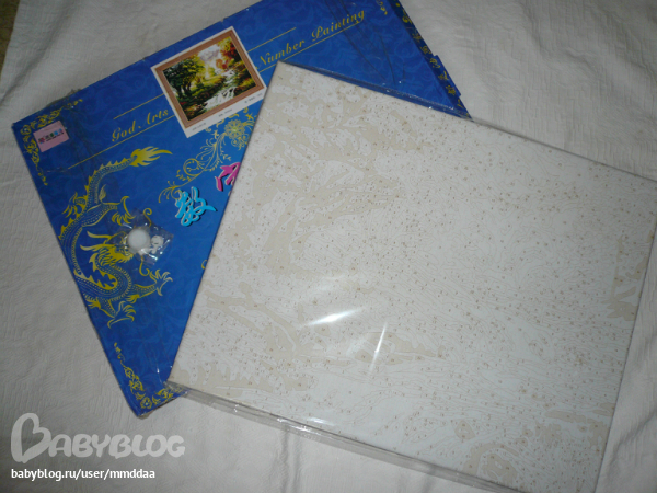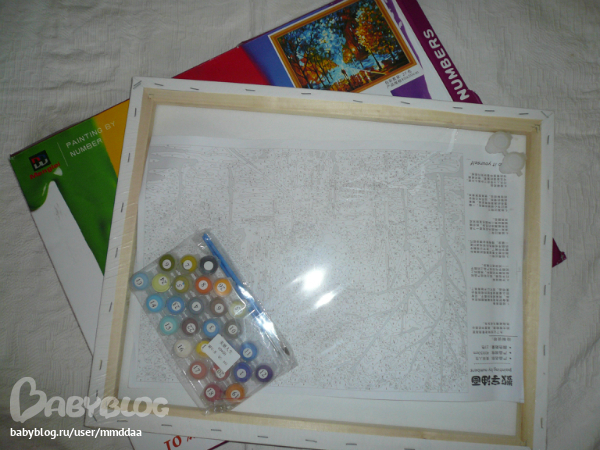 Последние два набора - для раскрашивания. Вот что в них входит: рисунок нанесен на холст, есть дополнительная схема на бумаге, кисточки (потолще и потоньше), краски в баночках.