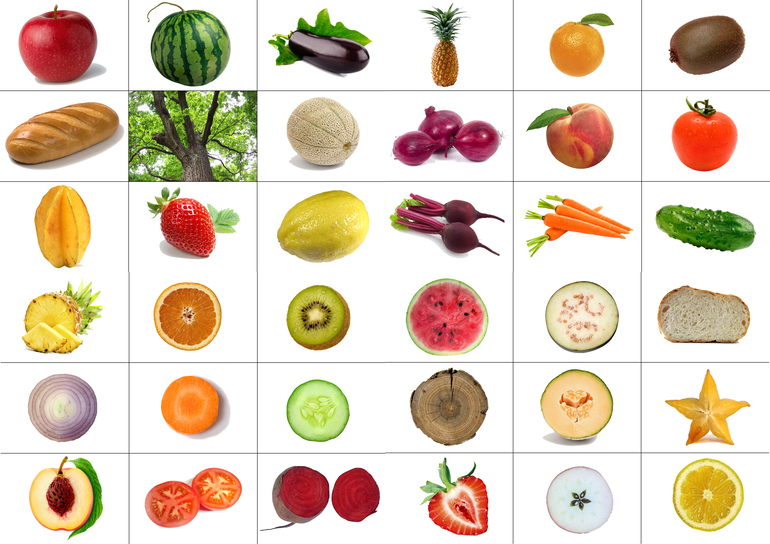 1. "А что внутри?" Эффект может неожиданным! Задание сделано по принципу лото: на одном поле собраны овощи, фрукты, некоторые другие предметы (можно увидеть на фото), на другом поле - их половинки. Задача - правильно подобрать одно к другому. Какое именно поле разрезать на карточки, в принципе, не важно. Мы разрезали то, что целое.