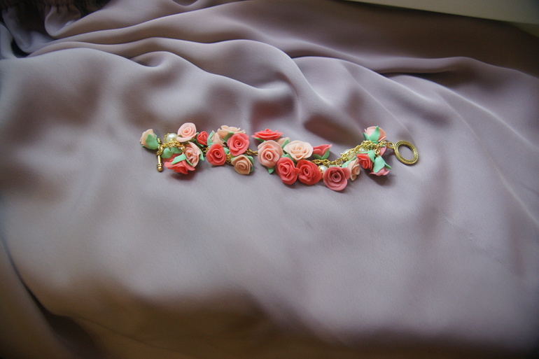 Новый браслетик из полимерной глины с жемчужными бусинами.Четыре оттенка роз,очень нежно выглядит.,к нему есть колечко, фото позже)
