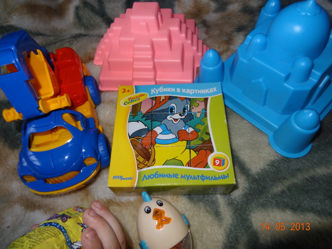 машинка, кубики (там есть герои наших любимых мультфильмов) и формы для игры в песке (я сначала подумала, что это формы для выпечки, пока не прочитала что это), цыпленок-калейдоскоп, шоколадный цыпленок (еле успела щелкнуть),