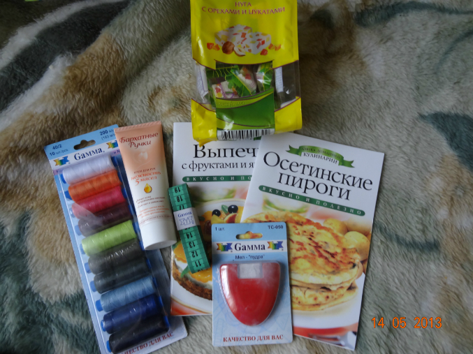 А это мне: ниточки для шитья, сантиметровая лента, мел-пудра, книжечки в мою коллекцию, кремушек для ручек и вкуснятину такую - "Столичные штучки" называются. Да еще для меня гель для душа.