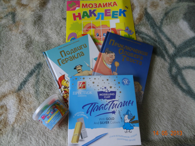 Две книги, тесто для лепки(пока припрятала), пластилин, книжка с наклейками,