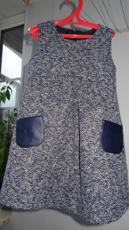 Сарафан из трикотажа букле на рост 110 см., накладные карманы из кожзама, сзади потайная молния /запасная прилагается/, верх и карманы на подкладе.