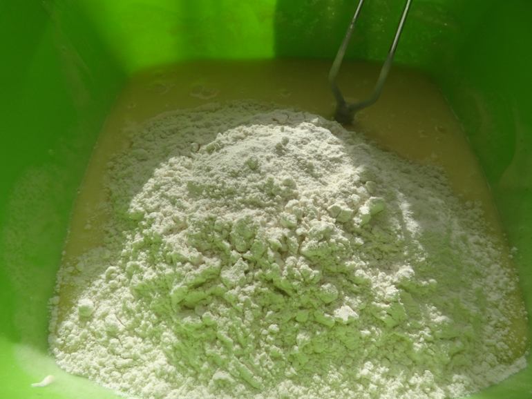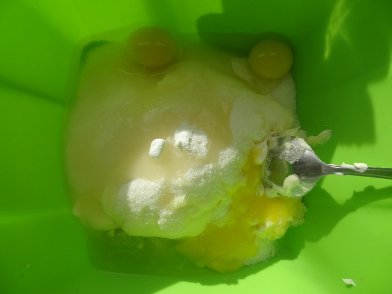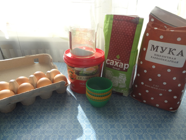 Ингридиенты - 1 баночка майонеза, -3 яйца. 1/3 ч.л. соды/не гасить/, 0,5-1 баночка сахара, 1-2 баночки муки/в зависимости от клейковины муки/, изюм, цукаты по вкусу.