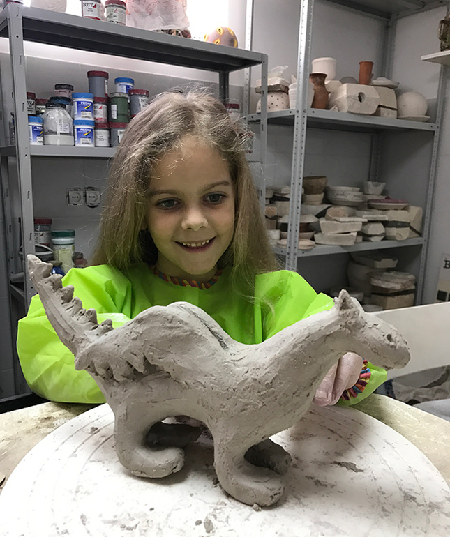 Конечно, гончар немного помогал. Очень увесистая получилась фигурка, глина упругая, работать было сложно. А вот с предметами попроще Алиса справлялась в два счета.