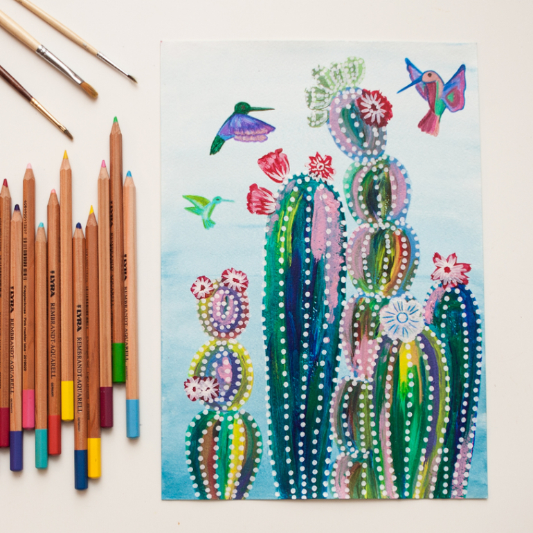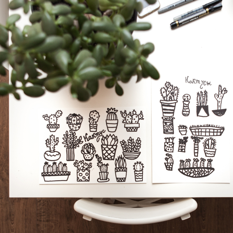 А это снова кактусы, но уже в другой технике. Слева - моё, справа - Алисино.