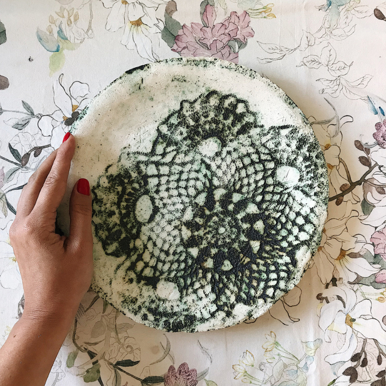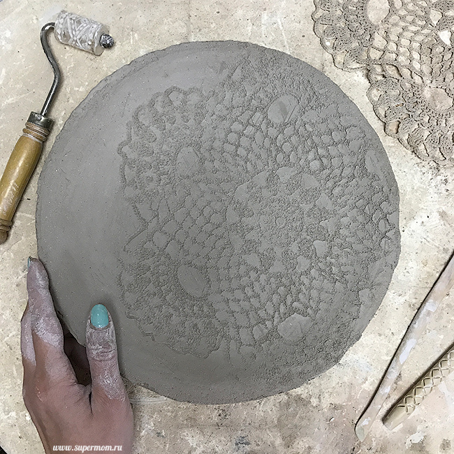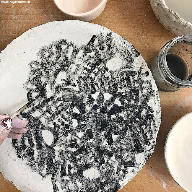 Тем летом у нас была только проба пера. На самом деле нужно было продумать концепцию посуды и сделать себе сервиз. Я же вместо этого каждый раз делала разные вещи, совершенно не подходящие друг к другу. Вот моя любимая тарелочка. Этапы работы.