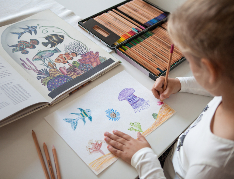 Я в такие моменты сижу рядом и подсказываю, что еще можно сделать и как дальше. Это такое маленькое введение в калиграфию: все линии ровные и выверенные, все детали должны быть одного размера. В общем, подготовка руки к письму, но другими способами.